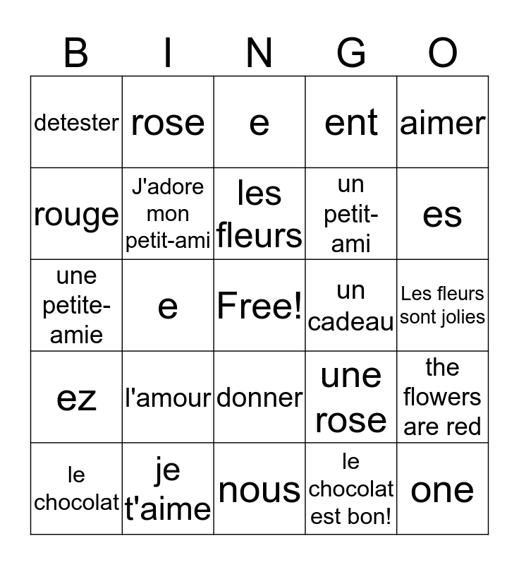 This bingo card has a free space and 24 words: l'amour, je t'aime, les fleurs, le chocolat, aimer, detester, rouge, rose, un cadeau, donner, un petit-ami, une petite-amie, une rose, the flowers are red, J'adore mon petit-ami, le chocolat est bon!, Les fleurs sont jolies, e, es, e, one, ez, ent and nous.