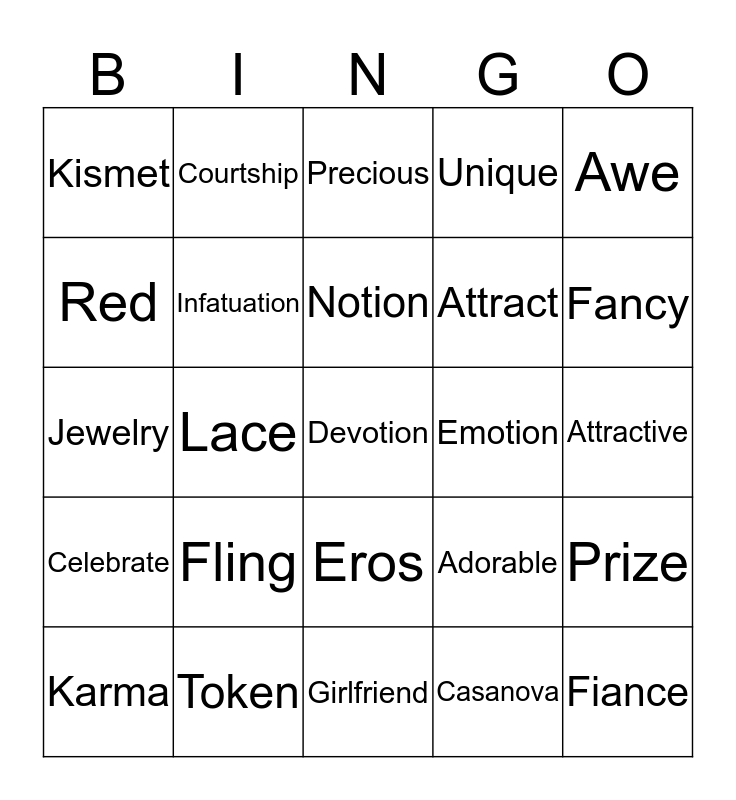 This bingo card has 152 words: Free!, Admiration, Adorable, Adore, Affection, Allegiance, Amorous, Amour, Angel, Ardent, Ardor, Attachments, Attract, Attraction, Attractive, Awe, Beau, Beautiful, Beauty, Beloved, Bonds, Boyfriend, Candy, Captivate, Cards, Care, Casanova, Celebrate, Charm, Cherish, Chocolate, Commitment, Cordial, Courtship, Cozy, Cupid, Darling, Date, Dear, Declaration, Desire, Devoted, Devotion, Dine, Doilies, Don Juan, Dreamy, Embrace, Emotion, Enamored, Endear, Engagement, Eros, Eternal, Excite, Fancy, Fantasy, Fascinate, Fascination, Favor, Favorite, Fellowship, Fiance, Fiancee, Flavor, Fling, Flirt, Flowers, Fondle, Friendship, Gallant, Gem, Gifts, Girlfriend, Goodness, Heart, Heartthrob, Honey, Honor, Hugs, Idolize, Inamorata, Inclination, Infatuation, Jewelry, Jewels, Joy, Karma, Kismet, Kisses, Lace, Liaison, Lifelong, Like, Lilies, Lothario, Love, Lover, Lovesick, Marry, Maternal, Mostly, Nighttime, Nirvana, Notion, Nurture, Only one, Opulent, Osculation, Passion, Perfume, Precious, Prize, Profess, Quaint, Quality, Queen, Red, Remembrance, Restaurant, Revere, Ribbon, Riddle, Romance, Romantic, Romeo, Seduce, Smitten, Special, Suitor, Surprise, Sweet, Sweetheart, Swoon, Tantalizing, Tender, Tenderness, Token, Truelove, Unique, Unusual, Us, Valentino, Venus, Verses, Warmth, Woo, Xxx, Yearning, Youth, Zest and FREE.