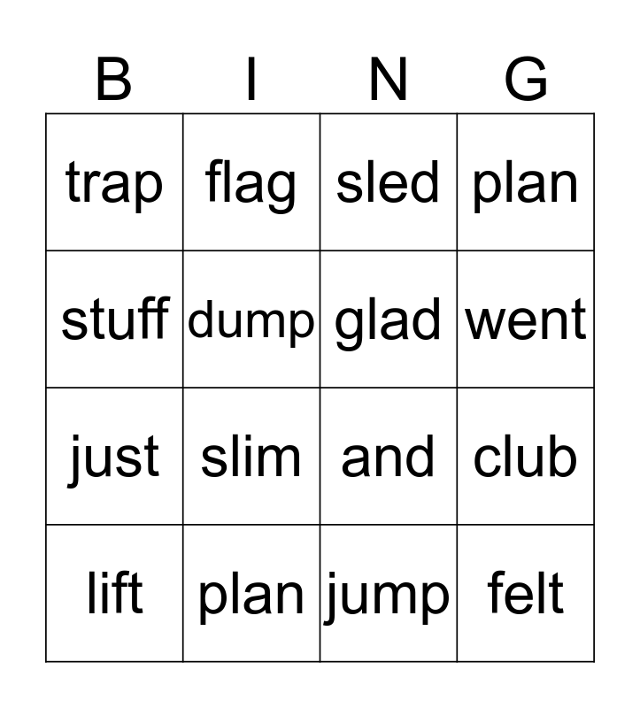 This bingo card has 16 words: plan, club, sled, trap, just, flag, and, jump, stuff, dump, lift, plan, slim, went, glad and felt.