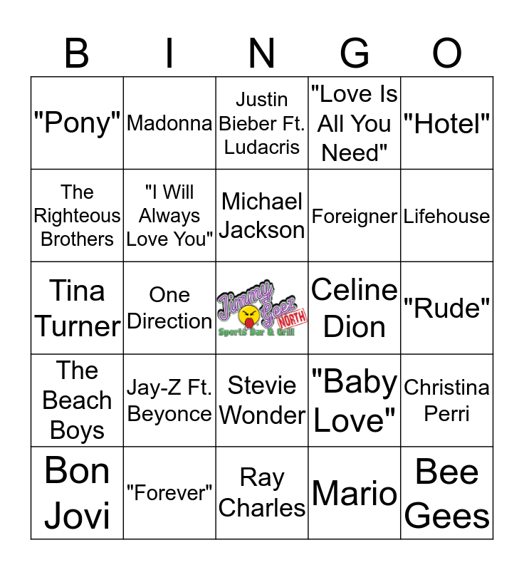 This bingo card has a free space and 24 words: Jay-Z Ft. Beyonce, "Forever", Michael Jackson, Bon Jovi, "Hotel", "Pony", The Righteous Brothers, Madonna, Celine Dion, Stevie Wonder, Foreigner, Tina Turner, "Baby Love", Christina Perri, "I Will Always Love You", Mario, "Rude", Justin Bieber Ft. Ludacris, Lifehouse, One Direction, Bee Gees, The Beach Boys, "Love Is All You Need" and Ray Charles.