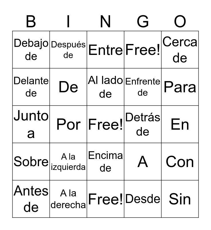 This bingo card has a free space and 24 words: A la izquierda, A la derecha, Al lado de, Antes de, Cerca de, Debajo de, Delante de, Después de, Detrás de, Encima de, Enfrente de, Junto a, A, Con, De, Desde, En, Entre, Para, Por, Sin, Sobre, Free! and Free!.