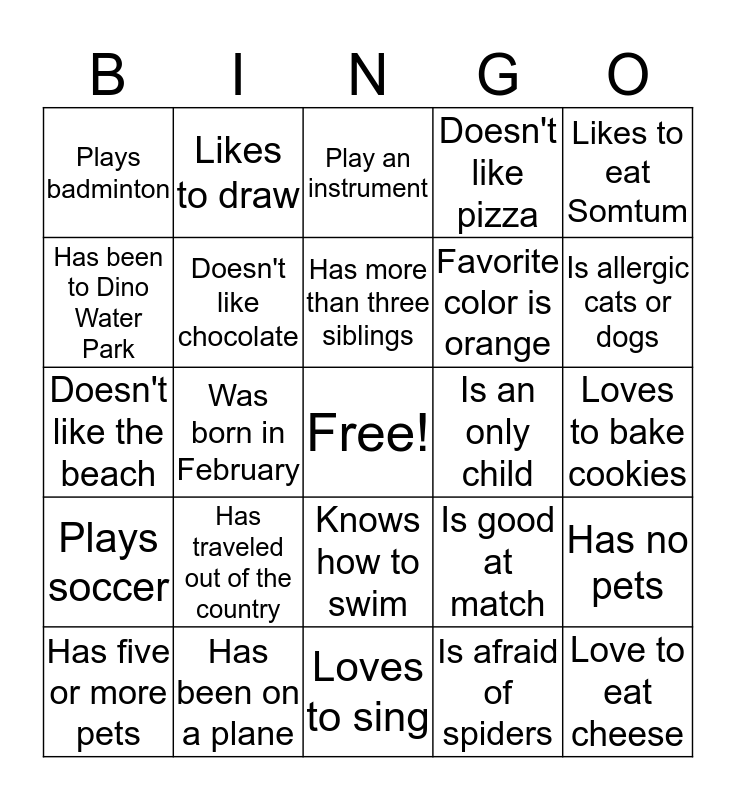 This bingo card has a free space and 24 words: Has traveled out of the country, Has been on a plane, Has more than three siblings, Has five or more pets, Likes to eat Somtum, Plays badminton, Has been to Dino Water Park, Likes to draw, Is an only child, Knows how to swim, Favorite color is orange, Doesn't like the beach, Is good at match, Has no pets, Doesn't like chocolate, Is afraid of spiders, Loves to bake cookies, Play an instrument, Is allergic cats or dogs, Was born in February, Love to eat cheese, Plays soccer, Doesn't like pizza and Loves to sing.
