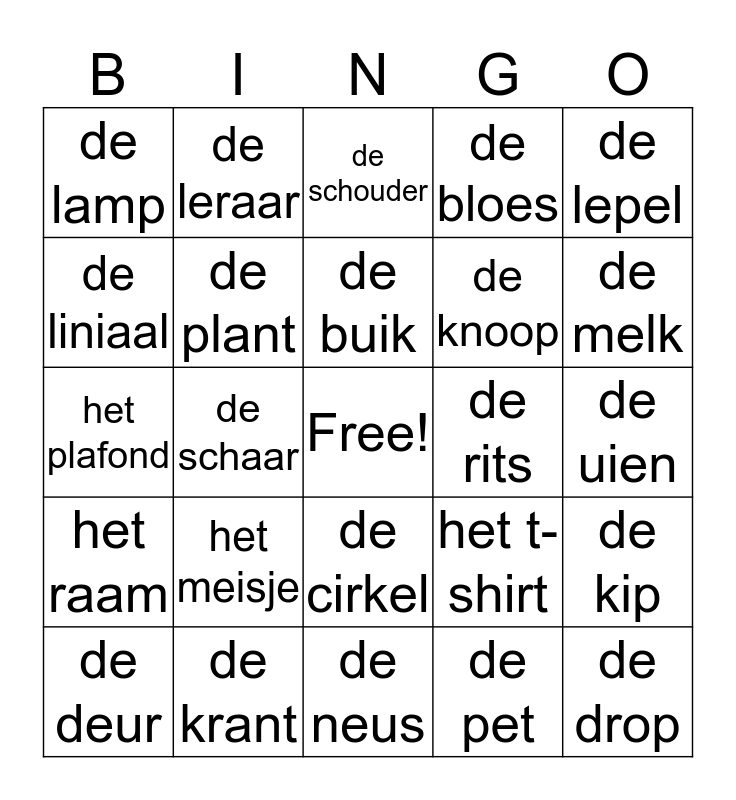 This bingo card has a free space and 24 words: de deur, het meisje, de buik, de pet, de lepel, de lamp, de leraar, de schouder, de rits, de uien, het plafond, de plant, het t-shirt, de kip, de liniaal, de krant, de neus, de bloes, de melk, het raam, de schaar, de cirkel, de knoop and de drop.