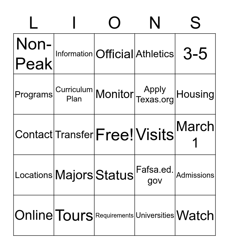 This bingo card has a free space and 24 words: Majors, Tours, Monitor, Online, 3-5, Non-Peak, Programs, Information, Visits, Status, Apply Texas.org, Contact, Fafsa.ed. gov, Admissions, Curriculum Plan, Universities, March 1, Official, Housing, Transfer, Watch, Locations, Athletics and Requirements.