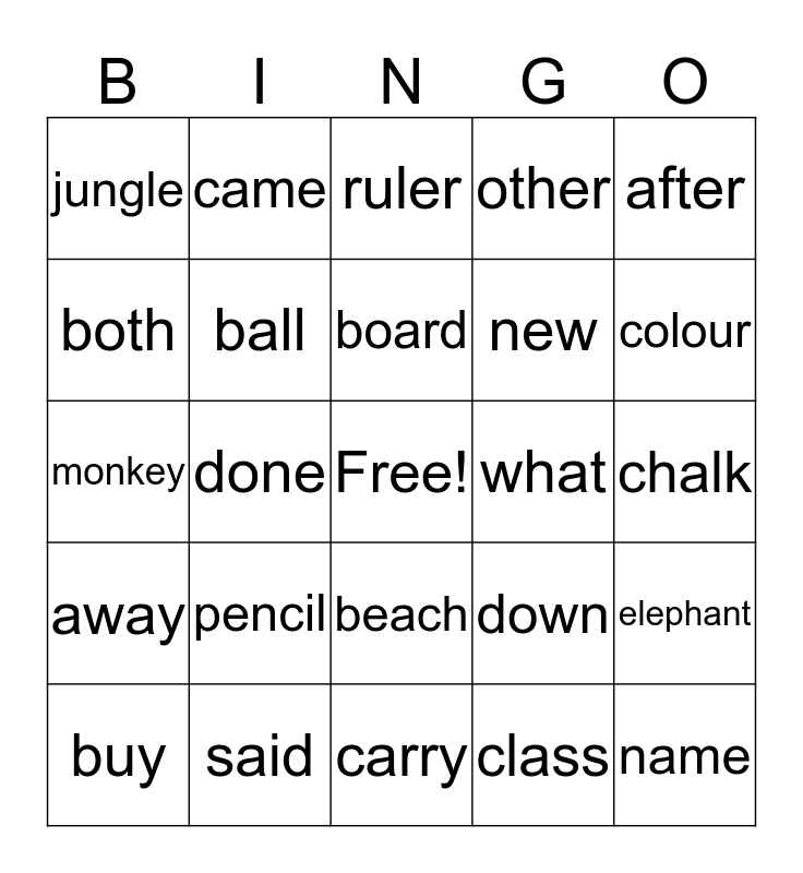 This bingo card has a free space and 24 words: pencil, said, board, buy, after, jungle, both, came, what, beach, new, monkey, down, elephant, ball, class, chalk, ruler, colour, done, name, away, other and carry.