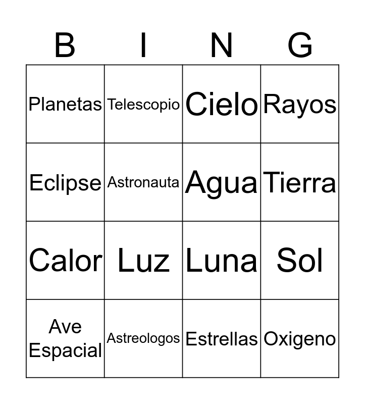 This bingo card has 16 words: Ave Espacial, Astreologos, Cielo, Rayos, Eclipse, Telescopio, Luna, Sol, Planetas, Astronauta, Estrellas, Tierra, Calor, Luz, Agua and Oxigeno.
