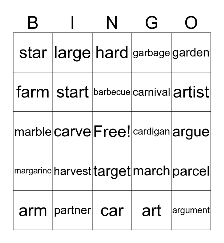 This bingo card has a free space and 29 words: arm, part, carve, darling, star, hard, start, harvest, cardigan, partner, argue, argument, car, art, artist, bargain, target, margarine, garden, marble, march, garlic, carnival, farm, garbage, large, parcel, barbecue and cardboard.