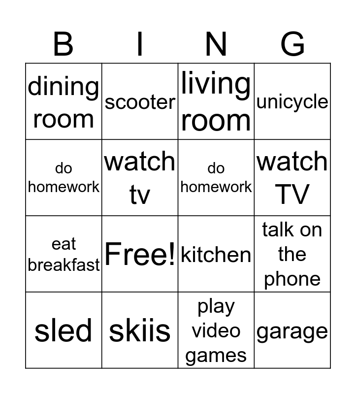 This bingo card has 18 words: Free!, garage, living room, dining room, kitchen, unicycle, sled, scooter, watch TV, eat breakfast, play video games, do homework, talk on the phone, watch tv, do homework, ride a bike, skiis and ice skates.