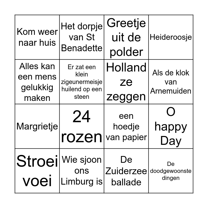 This bingo card has 20 words: O happy Day, Walking back to happines, Greetje uit de polder, Korenbloemen blauw, Stroei voei, Alles kan een mens gelukkig maken, Wie sjoon ons Limburg is, Kom weer naar huis, Margrietje, Het dorpje van St Benadette, 24 rozen, een hoedje van papier, Er zat een klein zigeunermeisje huilend op een steen, De doodgewoonste dingen, Holland ze zeggen, Faria, faria, Als de klok van Arnemuiden, Heideroosje, De Zuiderzee ballade and S nachts na tweeën.