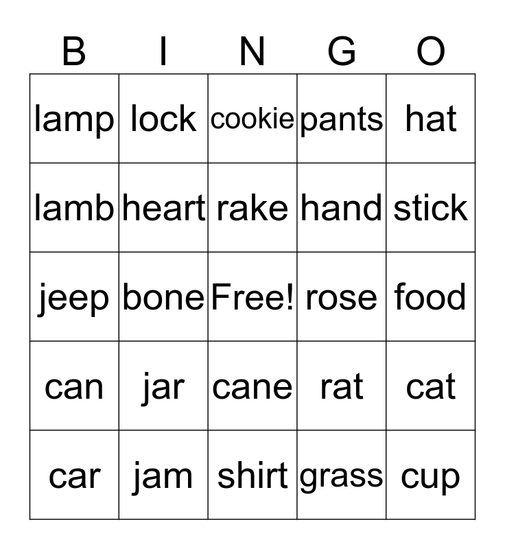 This bingo card has a free space and 24 words: jar, jam, rake, car, hat, lamp, lamb, lock, rose, cane, hand, jeep, rat, cat, heart, grass, food, cookie, stick, bone, cup, can, pants and shirt.