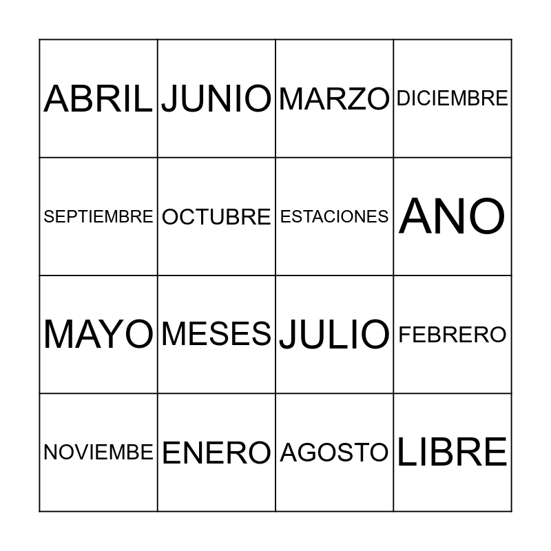 This bingo card has 16 words: ENERO, FEBRERO, MARZO, ABRIL, MAYO, JUNIO, JULIO, AGOSTO, SEPTIEMBRE, OCTUBRE, NOVIEMBE, DICIEMBRE, MESES, ANO, ESTACIONES and LIBRE.