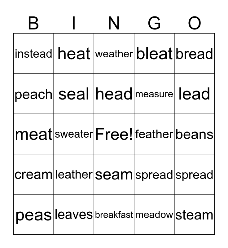 This bingo card has a free space and 24 words: leather, leaves, head, peas, bread, instead, peach, heat, feather, seam, measure, meat, spread, spread, seal, meadow, beans, weather, lead, sweater, steam, cream, bleat and breakfast.