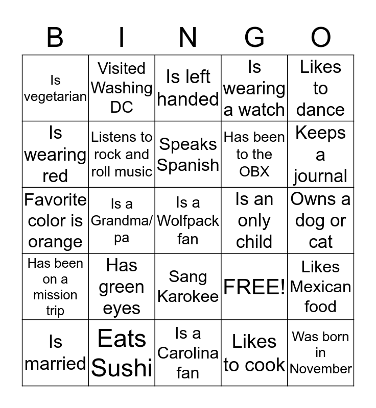 This bingo card has 25 words: Has green eyes, Is a Carolina fan, Speaks Spanish, Is married, Likes to dance, Is vegetarian, Is wearing red, Visited Washing DC, Is an only child, Sang Karokee, Has been to the OBX, Favorite color is orange, FREE!, Likes Mexican food, Listens to rock and roll music, Was born in November, Owns a dog or cat, Is left handed, Keeps a journal, Is a Grandma/ pa, Is a Wolfpack fan, Eats Sushi, Has been on a mission trip, Is wearing a watch and Likes to cook.