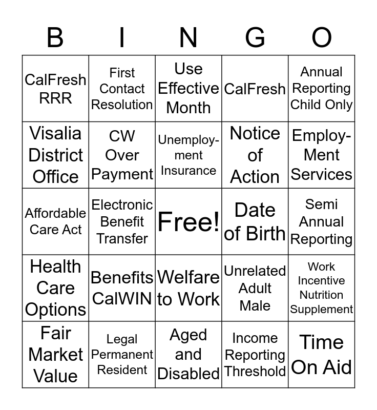 This bingo card has a free space and 24 words: Benefits CalWIN, Legal Permanent Resident, Unemploy- ment Insurance, Fair Market Value, Annual Reporting Child Only, CalFresh RRR, Visalia District Office, First Contact Resolution, Date of Birth, Welfare to Work, Notice of Action, Affordable Care Act, Unrelated Adult Male, Work Incentive Nutrition Supplement, CW Over Payment, Income Reporting Threshold, Semi Annual Reporting, Use Effective Month, Employ- Ment Services, Electronic Benefit Transfer, Time On Aid, Health Care Options, CalFresh and Aged and Disabled.