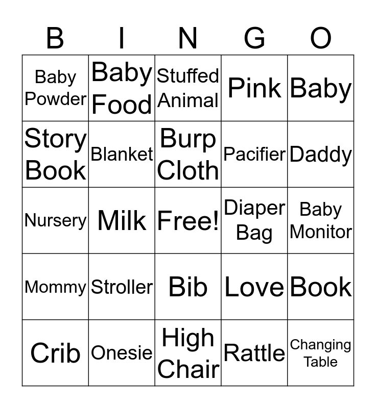 This bingo card has a free space and 24 words: Stroller, Onesie, Burp Cloth, Crib, Baby, Baby Powder, Story Book, Baby Food, Diaper Bag, Bib, Pacifier, Nursery, Love, Book, Blanket, Rattle, Baby Monitor, Stuffed Animal, Daddy, Milk, Changing Table, Mommy, Pink and High Chair.