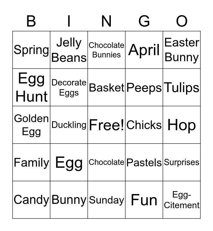 This bingo card has a free space and 24 words: Egg, Bunny, Basket, Candy, Easter Bunny, Spring, Egg Hunt, Jelly Beans, Chicks, Chocolate, Peeps, Golden Egg, Pastels, Surprises, Decorate Eggs, Fun, Hop, Chocolate Bunnies, Tulips, Duckling, Egg-Citement, Family, April and Sunday.