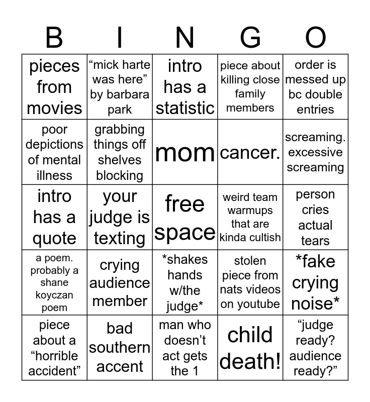 This bingo card has a free space and 24 words: crying audience member, bad southern accent, mom, piece about a “horrible accident”, order is messed up bc double entries, pieces from movies, poor depictions of mental illness, “mick harte was here” by barbara park, weird team warmups that are kinda cultish, *shakes hands w/the judge*, cancer., intro has a quote, stolen piece from nats videos on youtube, *fake crying noise*, grabbing things off shelves blocking, child death!, person cries actual tears, intro has a statistic, screaming. excessive screaming, your judge is texting, “judge ready? audience ready?”, a poem. probably a shane koyczan poem, piece about killing close family members and man who doesn’t act gets the 1.