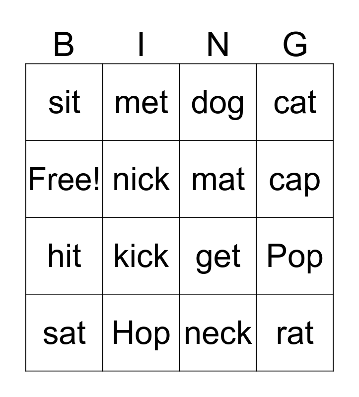 This bingo card has 16 words: Hop, Pop, dog, sit, hit, met, get, neck, Free!, nick, sat, cat, kick, cap, mat and rat.