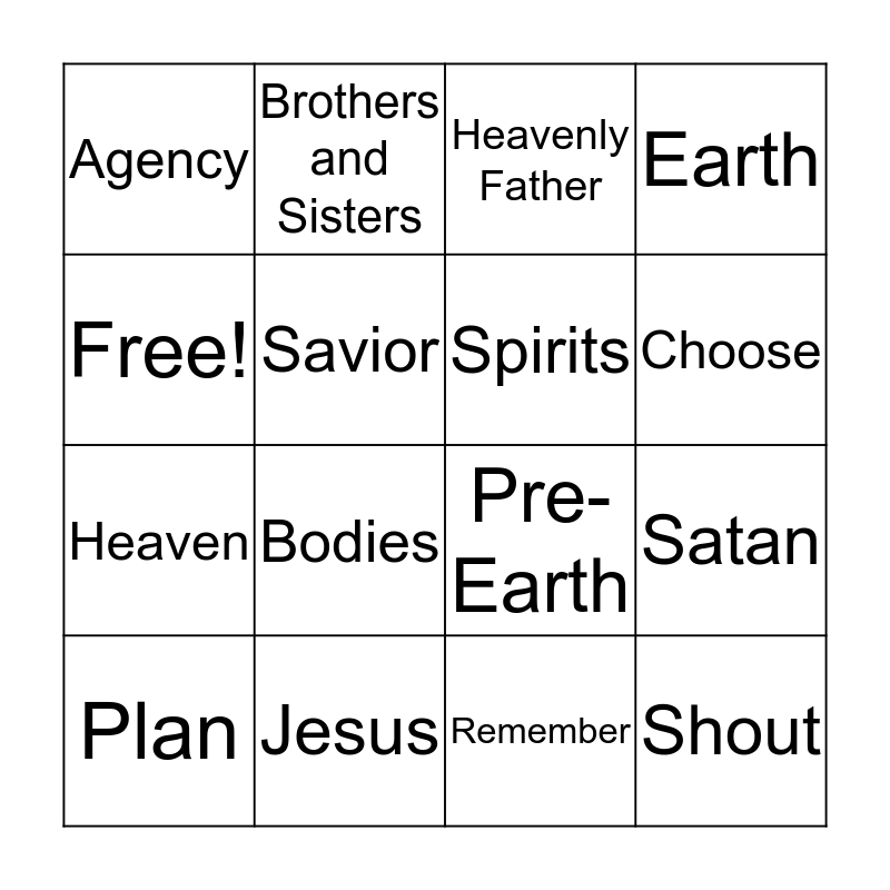 This bingo card has 16 words: Jesus, Satan, Heavenly Father, Agency, Heaven, Brothers and Sisters, Pre-Earth, Remember, Free!, Savior, Plan, Earth, Bodies, Choose, Spirits and Shout.