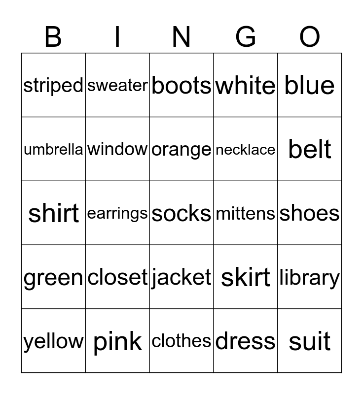 This bingo card has 25 words: closet, clothes, orange, yellow, blue, striped, umbrella, sweater, mittens, jacket, necklace, shirt, skirt, library, window, suit, shoes, boots, belt, earrings, socks, pink, green, white and dress.