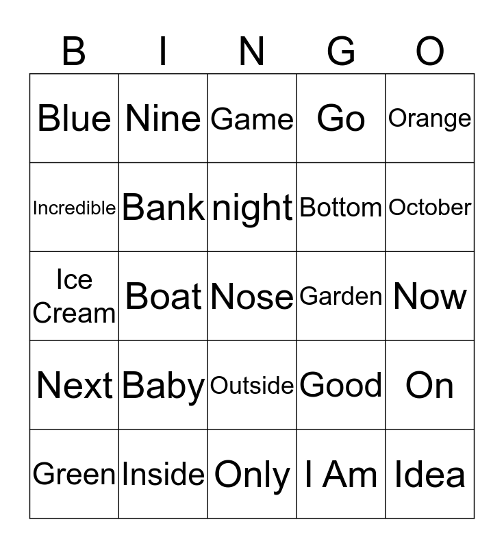 This bingo card has a free space and 24 words: Baby, Inside, night, Green, Orange, Blue, Incredible, Nine, Garden, Outside, Bottom, Ice Cream, Good, On, Bank, I Am, Now, Game, October, Boat, Idea, Next, Go and Only.