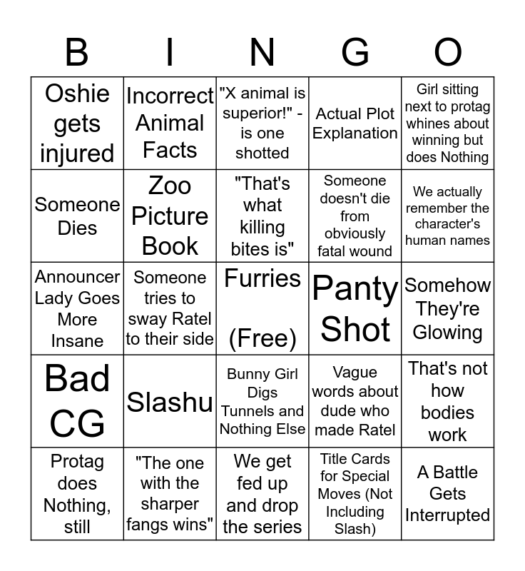 This bingo card has a free space and 24 words: Slashu, "The one with the sharper fangs wins", "That's what killing bites is", Protag does Nothing, still, Girl sitting next to protag whines about winning but does Nothing, Oshie gets injured, Someone Dies, Incorrect Animal Facts, Panty Shot, Bunny Girl Digs Tunnels and Nothing Else, Someone doesn't die from obviously fatal wound, Announcer Lady Goes More Insane, Vague words about dude who made Ratel, That's not how bodies work, Zoo Picture Book, Title Cards for Special Moves (Not Including Slash), Somehow They're Glowing, "X animal is superior!" -is one shotted, We actually remember the character's human names, Someone tries to sway Ratel to their side, A Battle Gets Interrupted, Bad CG, Actual Plot Explanation and We get fed up and drop the series.
