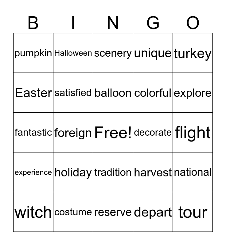 This bingo card has a free space and 24 words: holiday, costume, balloon, witch, turkey, pumpkin, Easter, Halloween, decorate, tradition, colorful, fantastic, harvest, national, satisfied, depart, flight, scenery, explore, foreign, tour, experience, unique and reserve.