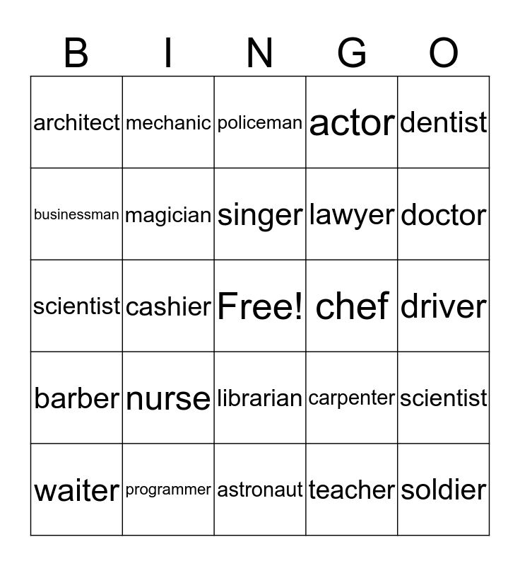 This bingo card has a free space and 24 words: nurse, programmer, singer, waiter, dentist, architect, businessman, mechanic, chef, librarian, lawyer, scientist, carpenter, scientist, magician, teacher, driver, policeman, doctor, cashier, soldier, barber, actor and astronaut.