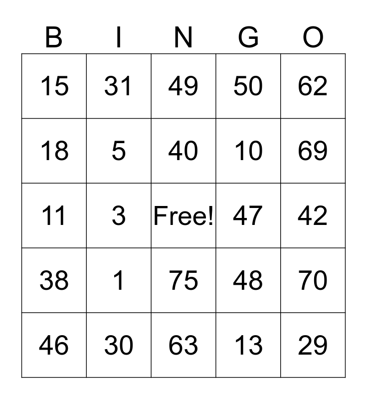 This bingo card has a free space and 24 words: 1, 30, 40, 46, 62, 15, 18, 31, 47, 75, 10, 11, 48, 70, 5, 13, 42, 49, 69, 3, 29, 38, 50 and 63.