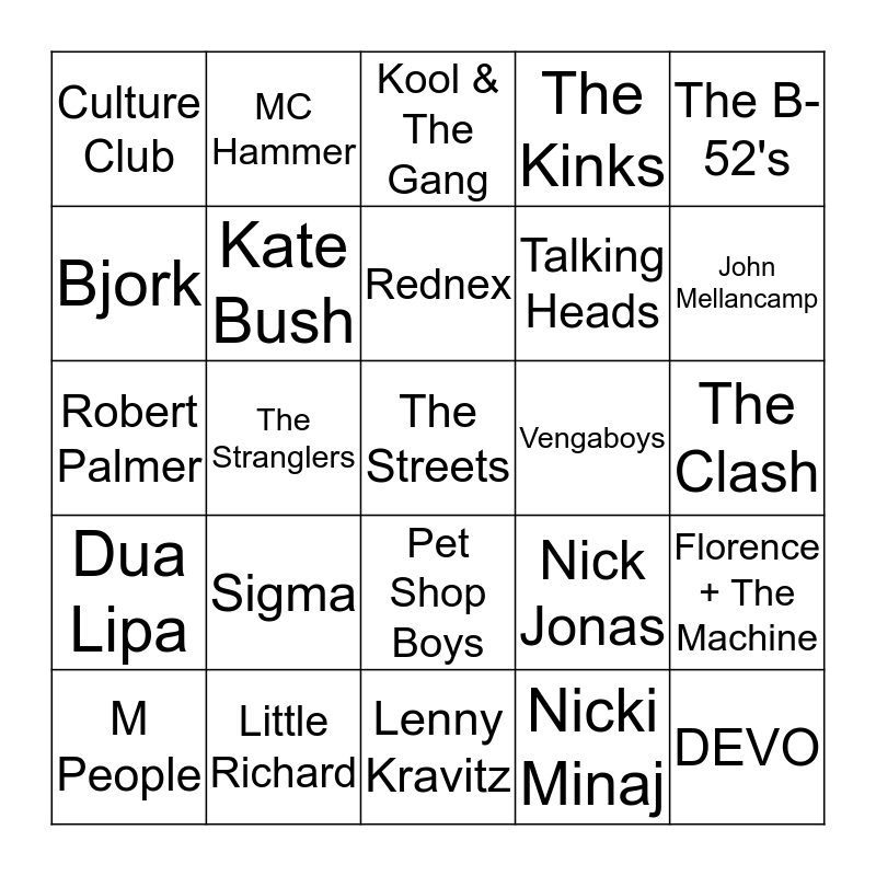 This bingo card has 53 words: Earth, Wind & Fire, The Streets, blink-182, Nicki Minaj, Sigma, Will Smith, MC Hammer, The Stone Roses, Bjork, The Knife, Kate Bush, Beastie Boys, Florence + The Machine, Nick Jonas, The Proclaimers, M People, Rednex, Vengaboys, The Ting Tings, The B-52's, The Stranglers, DEVO, Talking Heads, Culture Club, Katy Perry, Little Richard, The Beach Boys, The Rolling Stones, The Who, John Mellancamp, Van Morrison, The Prodigy, Dizzee Rascal, Basshunter, Foals, Alice Cooper, The Kinks, Lenny Kravitz, Kool & The Gang, Green Day, The Pointer Sisters, Prince, The Clash, Falco, Kim Carnes, Pet Shop Boys, Michael Jackson, The Police, Robert Palmer, Dua Lipa, Cream, Jimi Hendrix and The Go-Go's.