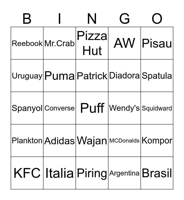 This bingo card has a free space and 24 words: Adidas, Italia, Patrick, KFC, Pisau, Reebook, Uruguay, Mr.Crab, Wendy's, Wajan, Diadora, Spanyol, MCDonalds, Kompor, Puma, Argentina, Squidward, Pizza Hut, Spatula, Converse, Brasil, Plankton, AW and Piring.