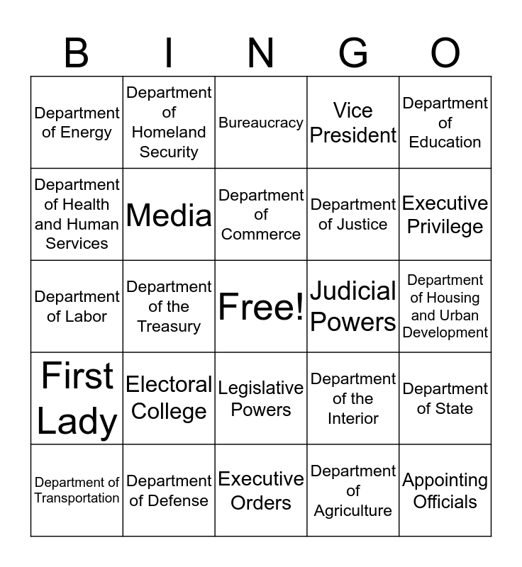 This bingo card has a free space and 26 words: Legislative Powers, Department of Agriculture, Department of Commerce, Department of Defense, Department of Education, Department of Energy, Department of Health and Human Services, Department of Homeland Security, Department of Housing and Urban Development, Department of the Interior, Department of Justice, Department of Labor, Department of State, Department of Transportation, Department of the Treasury, Department of Veteran's Affairs, Vice President, First Lady, Bureaucracy, Appointing Officials, Executive Privilege, Executive Orders, Judicial Powers, Electoral College, Media and Cabinet.