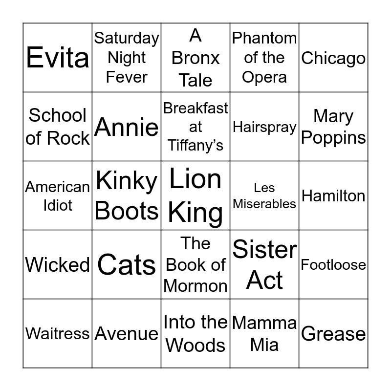 This bingo card has 41 words: Aladdin, American Idiot, Anastasia, Annie, Avenue, The Book of Mormon, Breakfast at Tiffany’s, Cabaret, Chicago, Wicked, Kinky Boots, Phantom of the Opera, Lion King, Hamilton, Les Miserables, Cats, Dream Girls, Evita, Elf: The Musical, A Bronx Tale, Footloose, Grease, Into the Woods, Hairspray, Jersey Boys, Legally Blonde, Mamma Mia, Matilda, Mary Poppins, The Producers, Peter Pan, Saturday Night Fever, Waitress, Shrek the musical, Sister Act, School of Rock, The Hunchback of Notre Dame, Groundhog Day, Catch Me If You Can, Cinderella and Legally Blonde.
