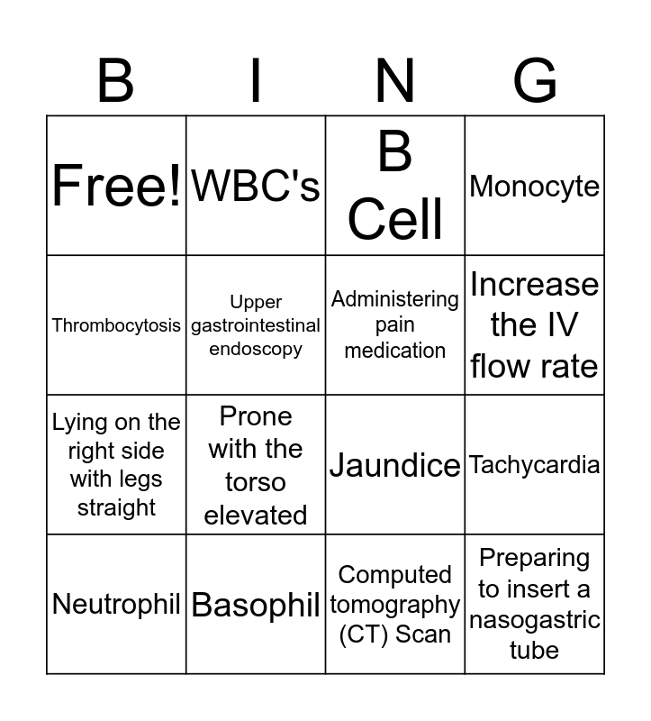 This bingo card has 16 words: Neutrophil, Basophil, B Cell, Monocyte, Thrombocytosis, WBC's, Jaundice, Tachycardia, Free!, Upper gastrointestinal endoscopy, Computed tomography (CT) Scan, Increase the IV flow rate, Lying on the right side with legs straight, Prone with the torso elevated, Administering pain medication and Preparing to insert a nasogastric tube.