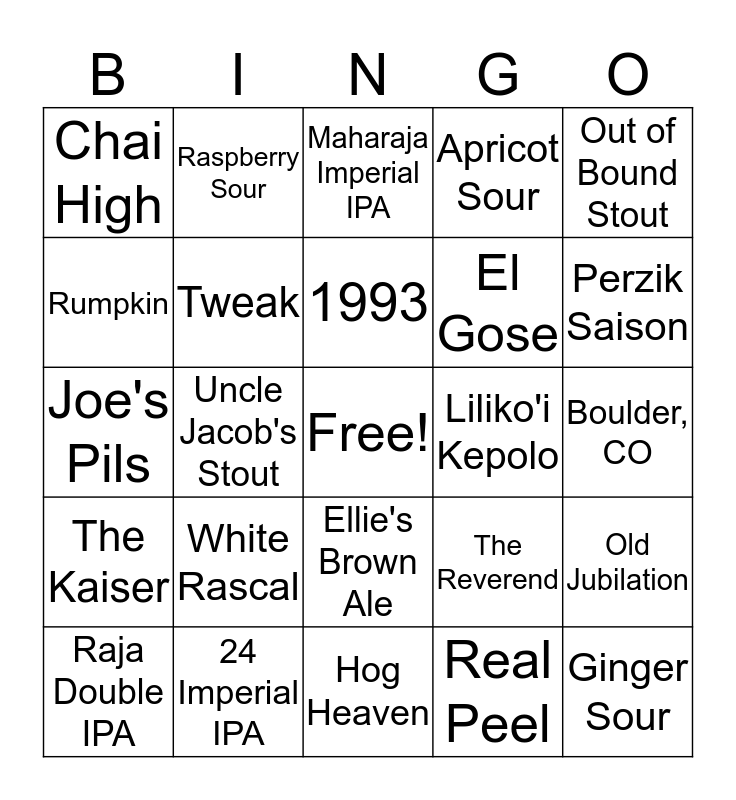 This bingo card has a free space and 25 words: White Rascal, Hog Heaven, 1993, Raja Double IPA, Out of Bound Stout, Chai High, Rumpkin, Raspberry Sour, Liliko'i Kepolo, Ellie's Brown Ale, El Gose, Joe's Pils, The Reverend, Old Jubilation, Tweak, Barrel-Aged, Boulder, CO, Maharaja Imperial IPA, Perzik Saison, Uncle Jacob's Stout, Ginger Sour, 24 Imperial IPA, The Kaiser, Apricot Sour and Real Peel.