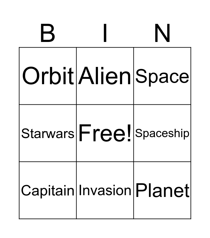 This bingo card has a free space and 8 words: Spaceship, Space, Alien, Capitain, Orbit, Planet, Starwars and Invasion.