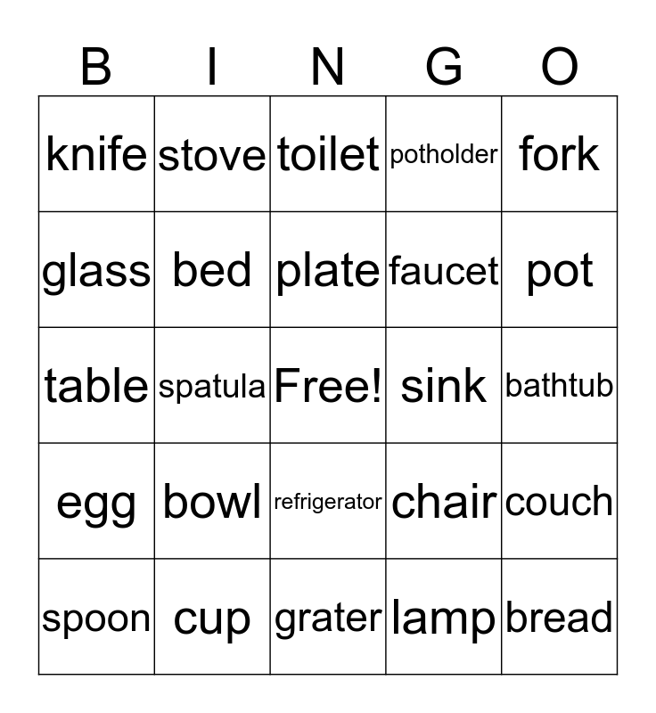 This bingo card has a free space and 24 words: bowl, cup, plate, spoon, fork, knife, glass, stove, sink, refrigerator, faucet, table, chair, couch, bed, lamp, bathtub, toilet, pot, spatula, bread, egg, potholder and grater.