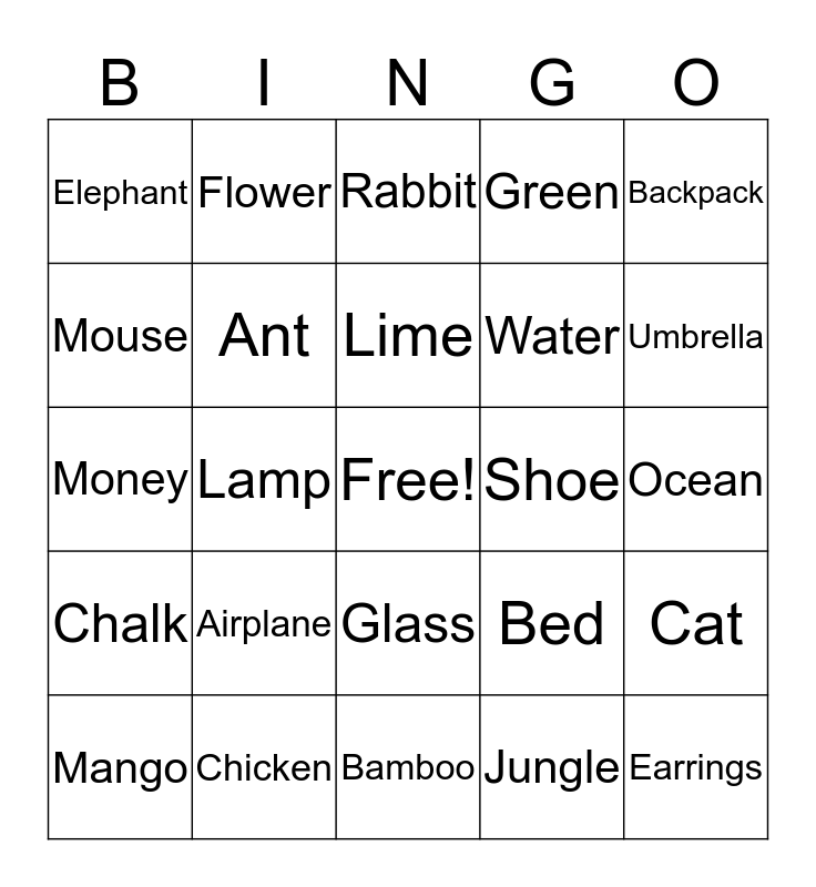 This bingo card has a free space and 24 words: Airplane, Chicken, Lime, Mango, Backpack, Elephant, Mouse, Flower, Shoe, Glass, Water, Money, Bed, Cat, Ant, Jungle, Ocean, Rabbit, Umbrella, Lamp, Earrings, Chalk, Green and Bamboo.