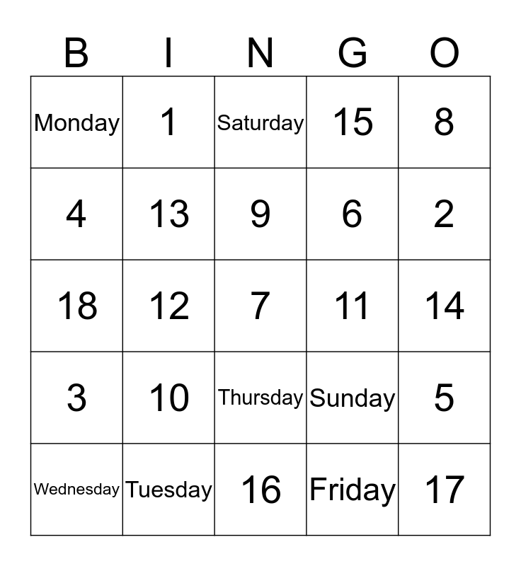 This bingo card has a free space and 24 words: 10, Tuesday, 9, Wednesday, 8, Monday, 4, 1, 11, Thursday, 6, 18, Sunday, 5, 13, Friday, 14, Saturday, 2, 12, 17, 3, 15 and 16.