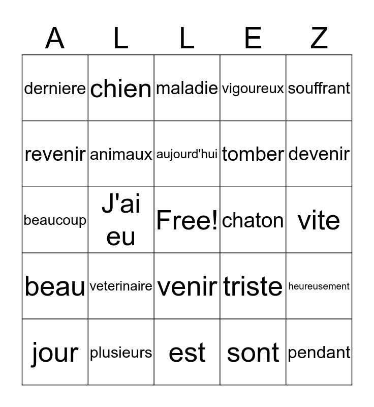 This bingo card has a free space and 24 words: veterinaire, plusieurs, aujourd'hui, jour, souffrant, derniere, revenir, chien, chaton, venir, tomber, beaucoup, triste, heureusement, animaux, sont, vite, maladie, devenir, J'ai eu, pendant, beau, vigoureux and est.