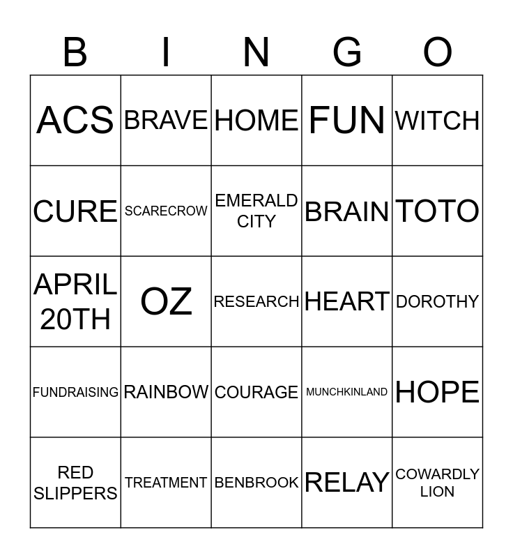 This bingo card has 25 words: RAINBOW, BENBROOK, EMERALD CITY, RED SLIPPERS, WITCH, ACS, CURE, BRAVE, HEART, COURAGE, BRAIN, APRIL 20TH, MUNCHKINLAND, HOPE, SCARECROW, COWARDLY LION, DOROTHY, HOME, TOTO, OZ, RESEARCH, TREATMENT, FUNDRAISING, FUN and RELAY.
