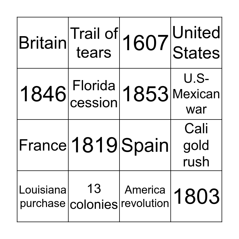 This bingo card has 16 words: 13 colonies, Cali gold rush, 1607, Britain, France, Trail of tears, Spain, America revolution, 1846, Florida cession, Louisiana purchase, United States, 1819, U.S-Mexican war, 1853 and 1803.