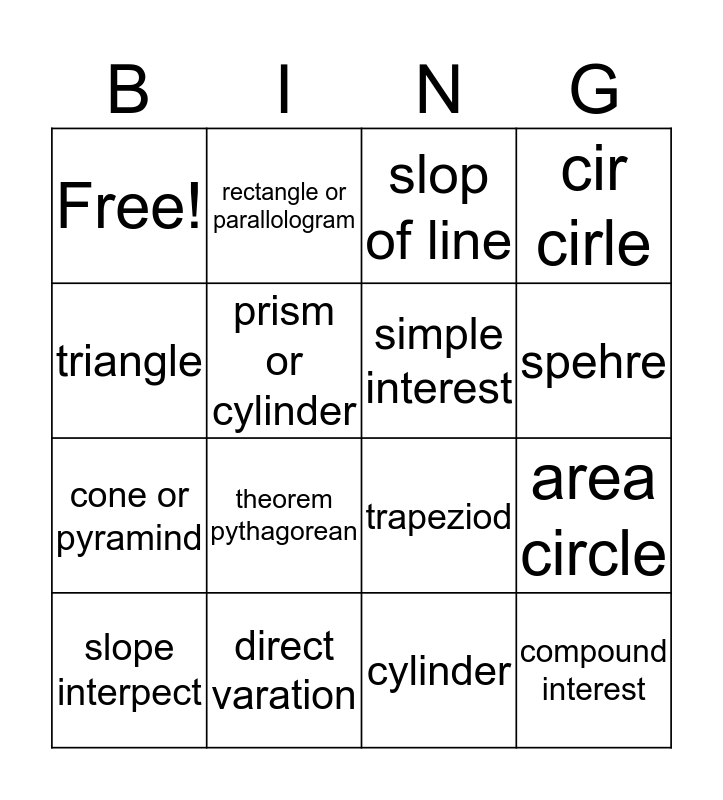 This bingo card has 16 words: slope interpect, direct varation, slop of line, cir cirle, triangle, rectangle or parallologram, trapeziod, area circle, Free!, prism or cylinder, cylinder, spehre, cone or pyramind, theorem pythagorean, simple interest and compound interest.