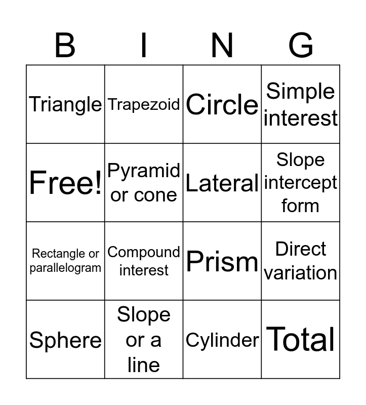 This bingo card has 16 words: Slope or a line, Direct variation, Circle, Triangle, Rectangle or parallelogram, Trapezoid, Prism, Cylinder, Free!, Pyramid or cone, Sphere, Simple interest, Compound interest, Slope intercept form, Lateral and Total.