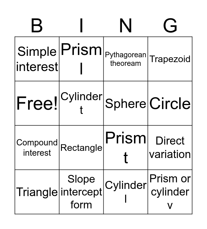 This bingo card has 16 words: Slope intercept form, Direct variation, Pythagorean theoream, Simple interest, Compound interest, Prism l, Prism t, Cylinder l, Free!, Cylinder t, Triangle, Trapezoid, Rectangle, Circle, Sphere and Prism or cylinder v.