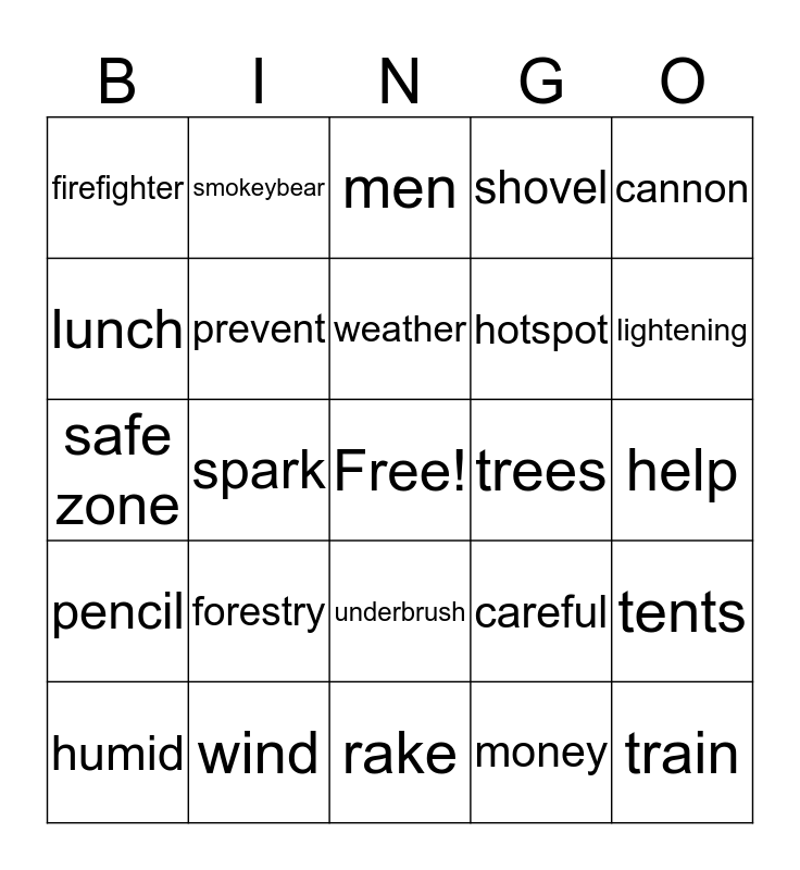This bingo card has a free space and 24 words: forestry, wind, weather, humid, cannon, firefighter, lunch, smokeybear, trees, underbrush, hotspot, safe zone, careful, tents, prevent, money, help, men, lightening, spark, train, pencil, shovel and rake.