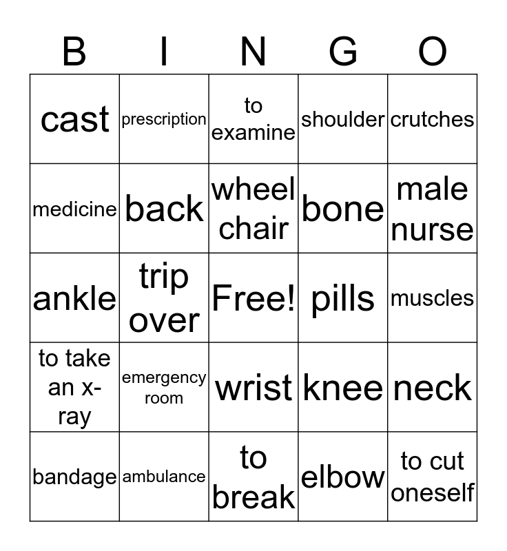 This bingo card has a free space and 24 words: emergency room, ambulance, wheel chair, bandage, crutches, cast, medicine, prescription, pills, wrist, bone, ankle, knee, neck, back, elbow, muscles, to examine, male nurse, trip over, to cut oneself, to take an x-ray, shoulder and to break.