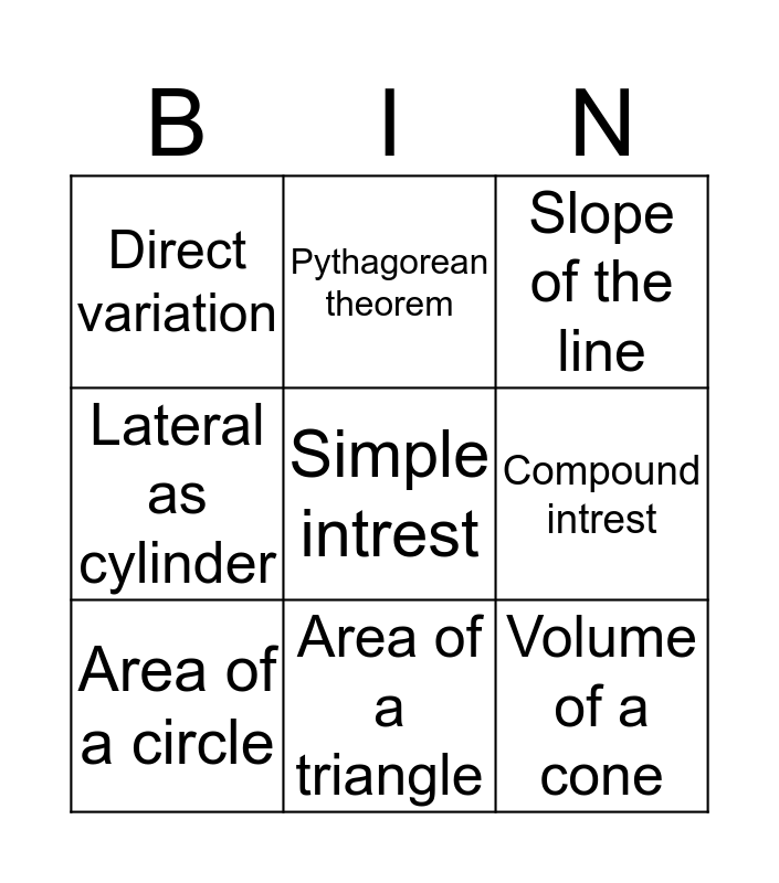This bingo card has a free space and 8 words: Compound intrest, Slope of the line, Pythagorean theorem, Area of a circle, Direct variation, Volume of a cone, Lateral as cylinder and Area of a triangle.