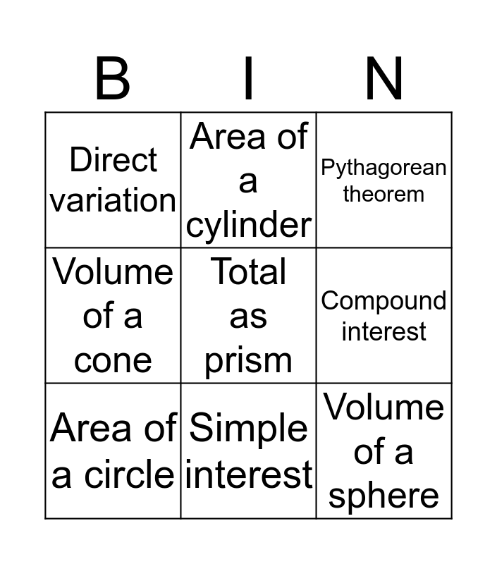 This bingo card has a free space and 8 words: Compound interest, Pythagorean theorem, Area of a cylinder, Area of a circle, Direct variation, Volume of a sphere, Volume of a cone and Simple interest.