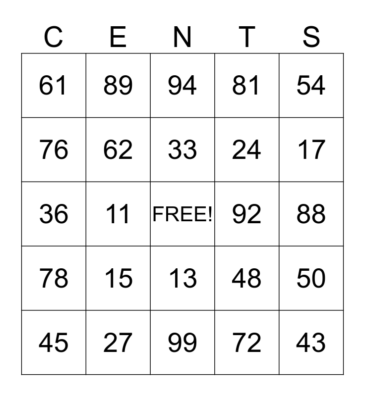 This bingo card has a free space and 24 words: 15, 27, 33, 45, 54, 61, 76, 89, 92, 13, 24, 36, 48, 50, 62, 72, 88, 94, 17, 11, 43, 78, 81 and 99.